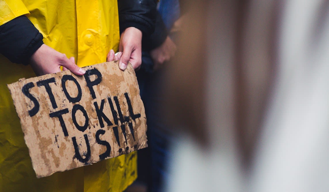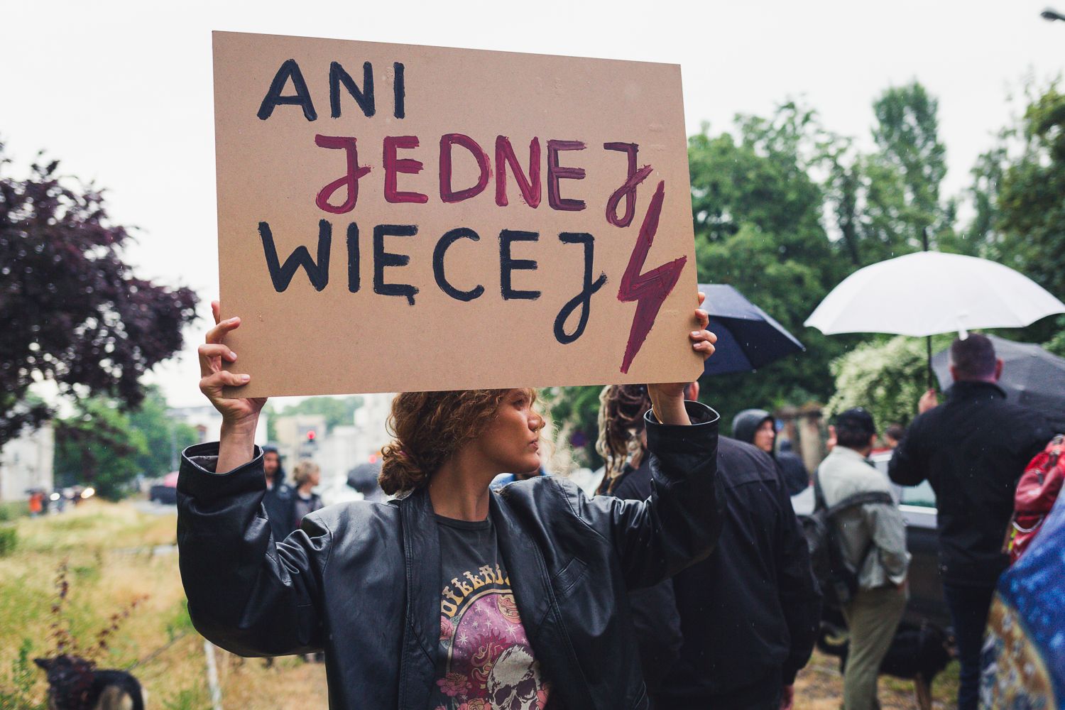 STOP TO KILL US” steht auf einem Plakat, eines von vielen, das an diesem regnerischen Junitag bei einer Demonstration in der polnischen Stadt Łódź zu sehen ist. Zahlreiche Menschen haben sich hier versammelt, um gegen die Abtreibungsgesetze der konservativen Regierung zu protestieren. Einige haben sich schwarze Blitze ins Gesicht gemalt, das Erkennungszeichen des Strajk Kobiet, der polnischen Frauenstreikbewegung.