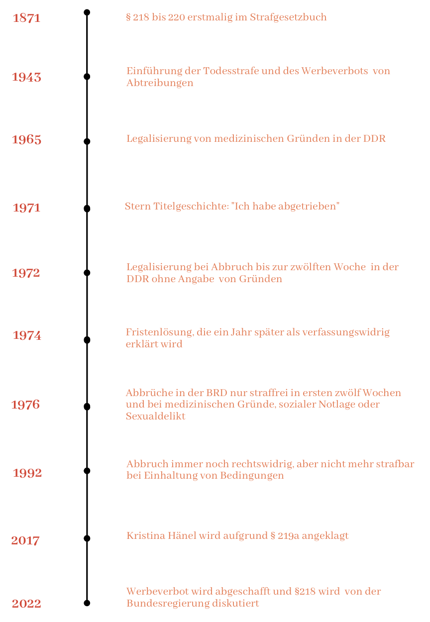 Ausschlaggebend für den Umgang mit Schwangerschaftsabbrüchen in Deutschland ist der Paragraph 218 des Strafgesetzbuches: »Wer eine Schwangerschaft abbricht, wird mit Freiheitsstrafe bis zu drei Jahren oder mit Geldstrafe bestraft«. Dieser Paragraf existiert seit über 150 Jahren in Deutschland und genießt bis heute Gültigkeit. In der DDR wurde das Recht auf Schwangerschaftsabbruch erstmalig in der deutschen Geschichte legal. Am 9. März 1972 erklärte der damalige Gesundheitsminister Ludwig Mecklinger das neue Gesetz über die Unterbrechung der Schwangerschaft in der ostdeutschen Öffentlichkeit.